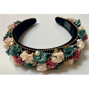 New Decorative Floral Headband With Faux Pearls & Crystals. Handmade flowers with black velveteen padding. Measures 16” Around Rim. read more...