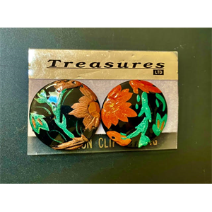 New Treasures Clip On Earrings. Wonderful salmon and green floral decorations.Measures 1 1/4” in Diameter. read more...