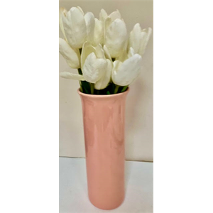 Salmon Ceramic Vase With New White Silk Tulips.Lovely decor vase with 14 tulips. Measures 17” High;5” in Diameter. Vase is in Excellent Condition read more...