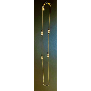 New Long Pearls With Gold Tone Chain Necklace.Lovely white faux pears with rhinestone bands decorate this necklace. Measures 13 1/2” Long. read more...
