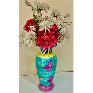 Butterfly Vase With Colorful Flower Arrangement.Beautifully hand painted vase with turquoise blueand lime green colors. Lovely rose and white coloredsilk flowers are added. Vase measures 12” High. All read more...