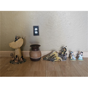 This lot of 5 collectible items range from Southwest story teller sculpture at 12 inches tall, to Indonesia pottery, Native american wood like carved decor, to two 4.5 inch Indian boy and girl statues