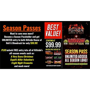 Get the BEST VALUE with a Season Pass to Hillside House of Hell + Bloodrush Forest of Terror!Enjoy unlimited entry all season long and unlock access to exclusive off-season events like:A Very Scary Ch read more...