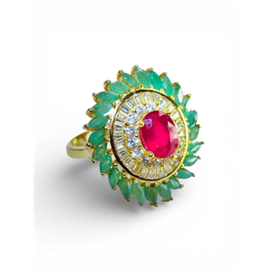 Authentic Ruby Gemstone 14K over .925 Sterling Silver RING Other stones: White Topaz & Genuine Emeralds Dimensions: Length 1 inch; Width 3/4