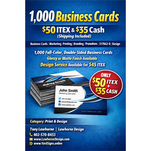 Get 1,000 high-quality business cards for just $50 ITEX + $35 cash (shipping). Cards are standard size, full-color, and double-sided—perfect for making a strong professional impression.Choose between